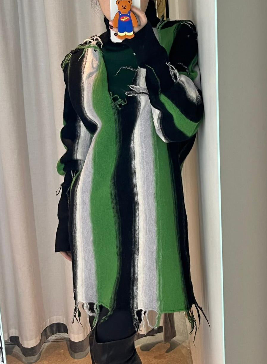 Bold striped long sweater vest with layered crewneck sweater with bold striped sleeves.