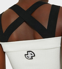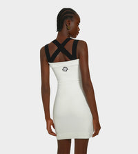 White knit dress. Textured 3D stitch, Short length. Fitted silhouette. Contrast details. Double straps that cross at the back. Mock pockets with gold-tone Patou buttons. JP embroidery at the back.