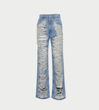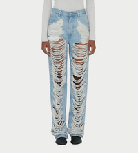 Denim 5-pocket navy blue jeans from MM6 Maison Margiela. Straight-leg non-stretch denim jeans. Fading throughout. Mid-rise. Belt loops. Five-pocket styling. Zip fly. Distressing at front legs. White