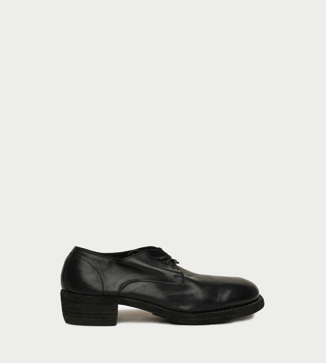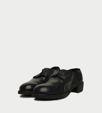 Round toe lace up loafer with low stacked leather heel. Each shoe is piece dyed resulting in beautiful tonal variations.