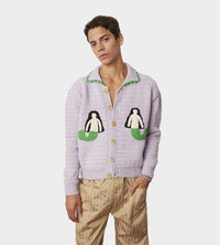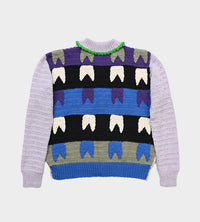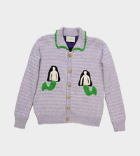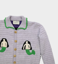 Thick gauge cotton, hand crocheted cardigan with bold striped pattern on the back. 2 crocket mermaid appliques on front with contrast Kelly green crochet trim around collar.