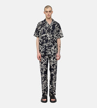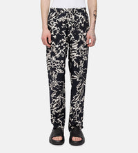 Lightweight cotton trousers in a bold abstract floral print. Elastic waistband with hook & eye closure at the waist and zipper fly. This pant is unlined.