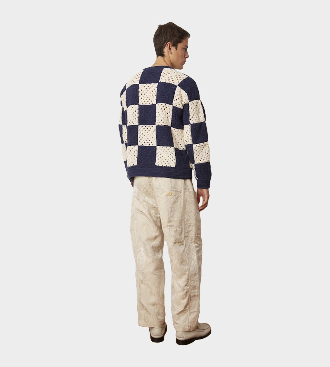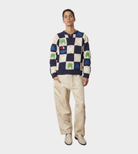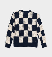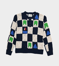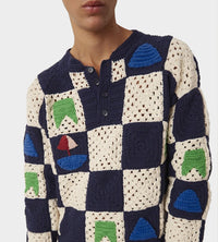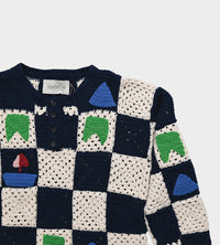 Thick gauge cotton, hand crocheted Henley shirt in a checkerboard pattern in navy and off white. Some squares feature Crochet appliques of flags, ships, and pennants.