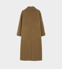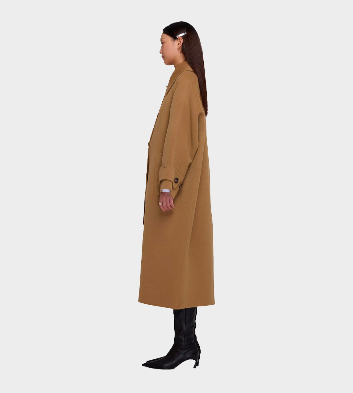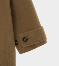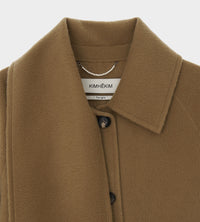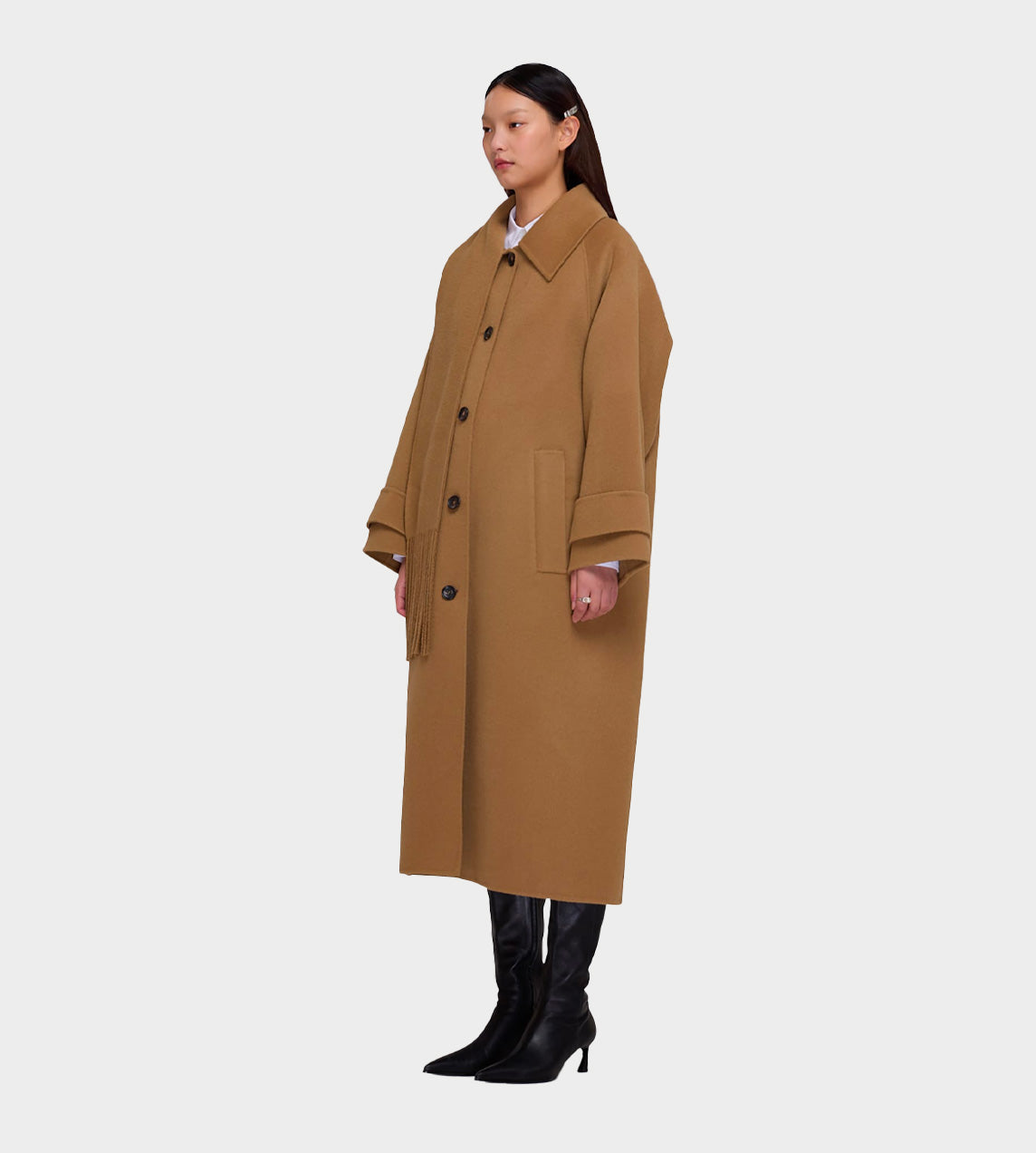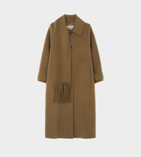 Fringe-edge straight hem long coat in dark beige color. Side welt pocket with front button fastening.