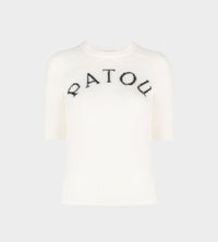Avalanche white baby alpaca blend top. Round neckline. Ribbed collar, cuffs and waist. Short sleeves. Patou jacquard at the front.