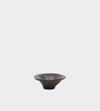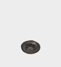 This handcrafted black stoneware plate features a smooth Shinto-glazed interior, creating a refined contrast between its raw exterior and polished core. The understated, minimalist design is complemented by a discreet logo stamp on the side, adding a subtle touch of artistry to this elegantly functional piece.