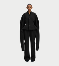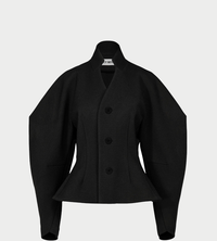 This collarless jacket is characterized by a well-defined sleeve form and a finish that expands and reimagines the perception of the body. Featuring a distinctive curved waist design, it accentuates the body contours beautifully. It is triple-woven using cotton warp threads and high-twist weft threads of polyester/polyurethane. The uneven textured surface has a robust density and moderate thickness, and despite being a cloth garment, offers just the right amount of stretch to hug the body comfortably.