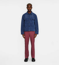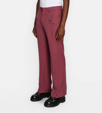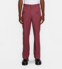 Vintage inspired, mid-rise trousers in a poly twill fabric. Slash pockets with button tab detail, and slit at ankle with snap closure.