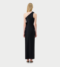 Details: One-shoulder design, front cut-out, 3D floral appliqués, side slit, asymmetrical hem.