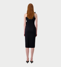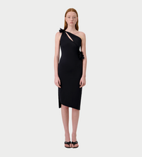 Stretch, asymmetric gown with petal knot detailing and a below-the-knee length.