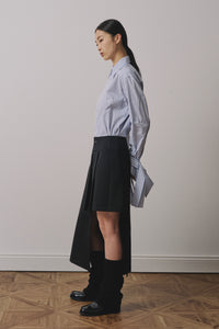 The wrap pleated skirt is defined by its asymmetric hem, creating visual interest on both sides. Versatile in styling, it can be layered over pants or worn in multiple ways for a contemporary look.