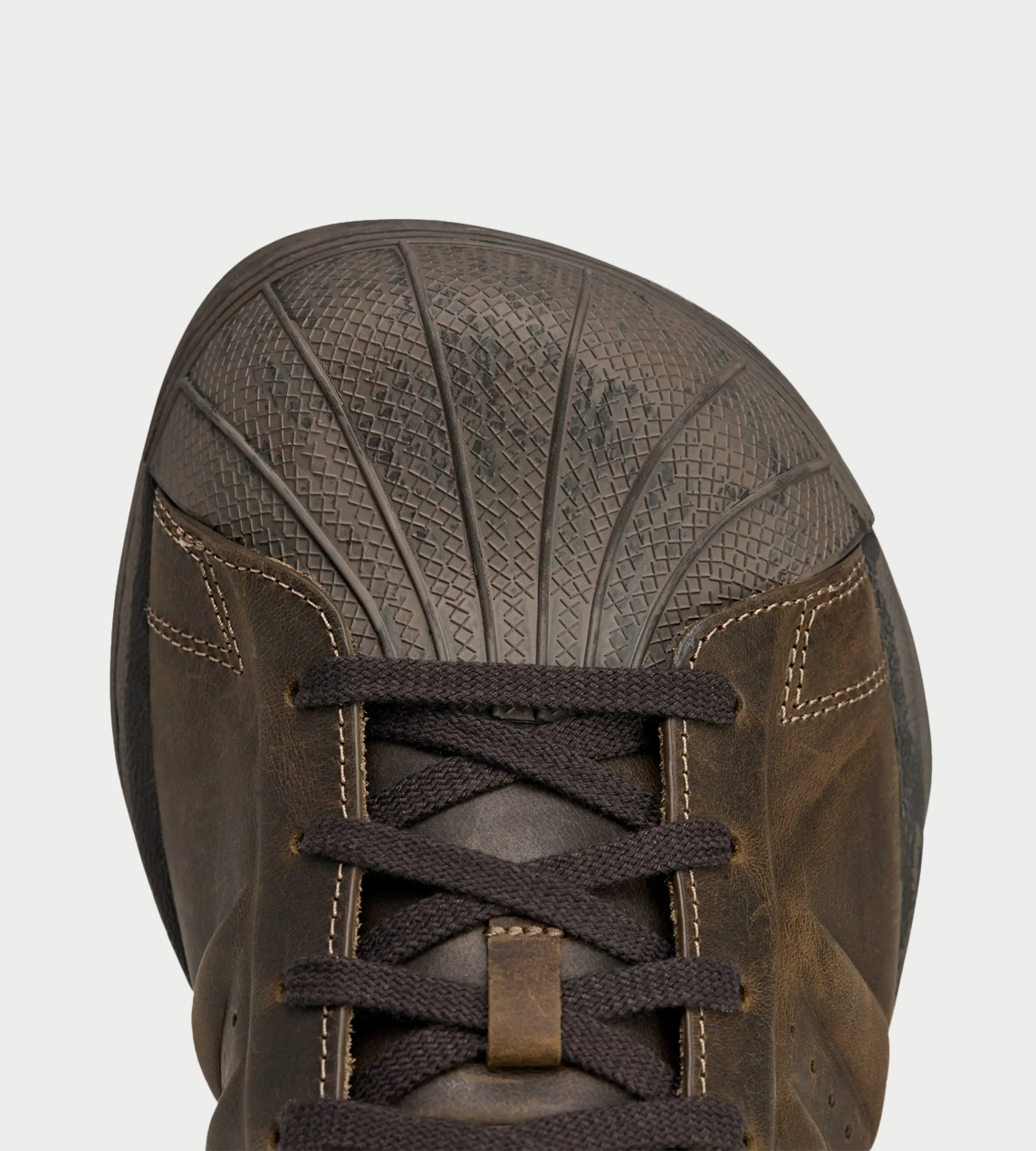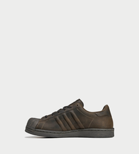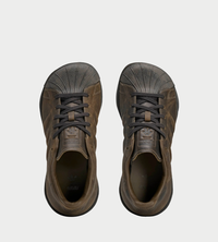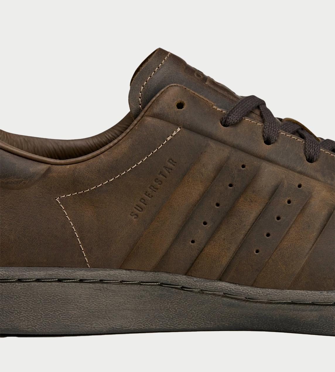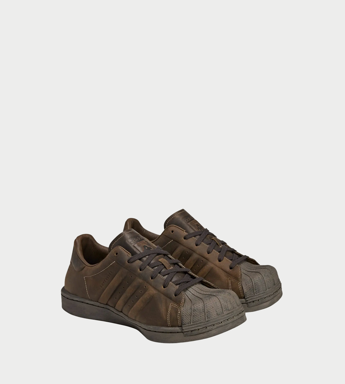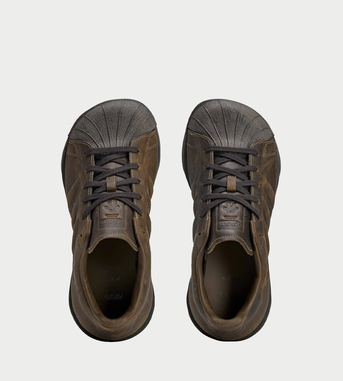 Adidas Originals by Avavav modified Superstar features a reshaped sole and classic rubber shell toe. Crafted in 100% leather with a two-tone, vacuum-molded upper that emphasizes embossed stripe details