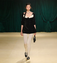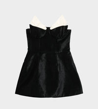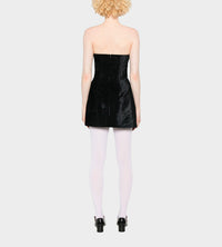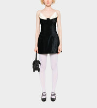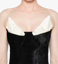 Polyester corduroy minidress. Darts and boning throughout. Floral accents at modified sweetheart neck and zip closure at back. Integrated bra with hook-eye fastening at interior. Elasticized waistband at interior.