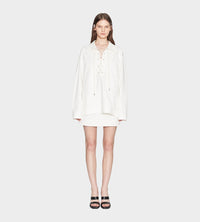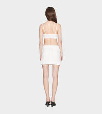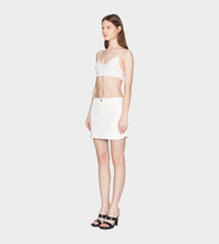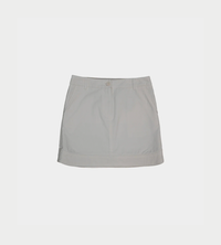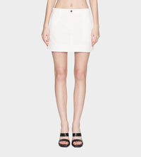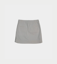 Lightweight denim mini skirt with trouser style pockets, and welt back pockets. Lined with lightweight polyester with a 2.5 inch band at the hem that curves up slightly at the sides.