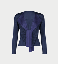This cardigan is characterized by its two-tone design in navy and purple color. The double-layered collar has inner facing material that can be tied to enjoy the contrast of the vivid colors.