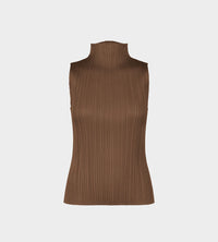 Basic sleeveless, pleated mock neck top. This silhouette is meant to be fitted.