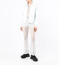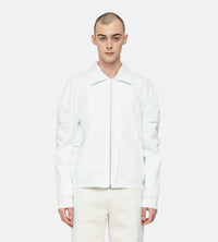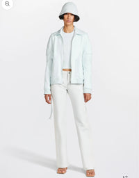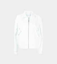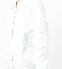 Compact cotton zipper front bomber, with 2 pockets on the front for hands, and 2 cargo pockets on the sleeve. Unfinished frayed edges trim the pocket flaps and collar, with