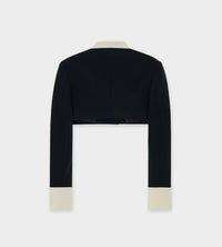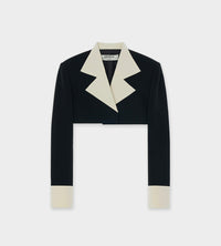 Contrast collar and cuff cropped jacket. Slim fit with additional support inside garment. Made in a wool crepe fabrication.