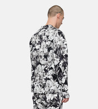 Brushed cotton, printed floral shirt/lightweight jacket with button front closure. Features 2 hidden pockets above the waist for hands, and 1 patch pocket on the front left chest.