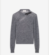 The standout feature is its asymmetrical cut-out neckline, secured with an adjustable buckle closure that adds an element of architectural intrigue. Long cuffed sleeves and a ribbed hem provide a tailored finish, balancing the bold design with classic knitwear elements. This piece offers a regular fit, making it versatile for layering or wearing on its own.