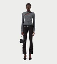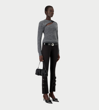 The Coperni Buckle Cut-Out Sweater in Grey redefines contemporary knitwear with its sculptural design and minimalist elegance. Crafted in Italy from a refined wool-blend fabric (45% polyamide, 30% wool, 25% viscose), this sweater offers a soft, breathable feel with a structured finish.