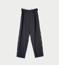 These slit pants feature a straight silhouette with a slight relaxed fit. The side of pants are defined with buttons that can be freely adjusted with different look.