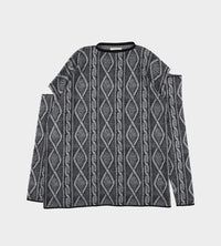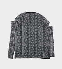 Oversized cable knit print intarsia sweater, with contrast crewneck in black. Asymmetric shoulder slash detail with slightly boxy fit.