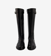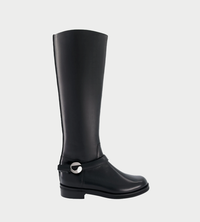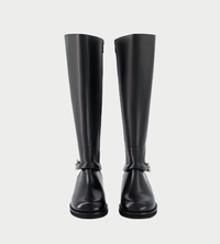 Inspired by classic riding boots, the Cavaliers are crafted from supple Italian black leather polished to a high gloss. They feature a thick sole and have an elegant curved profile with a rounded toe. At the top of the boot, a slim belt strap encircles the calf, decorated with a silver Coperni buckle.