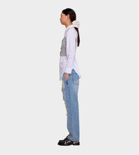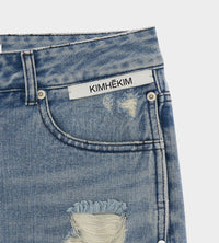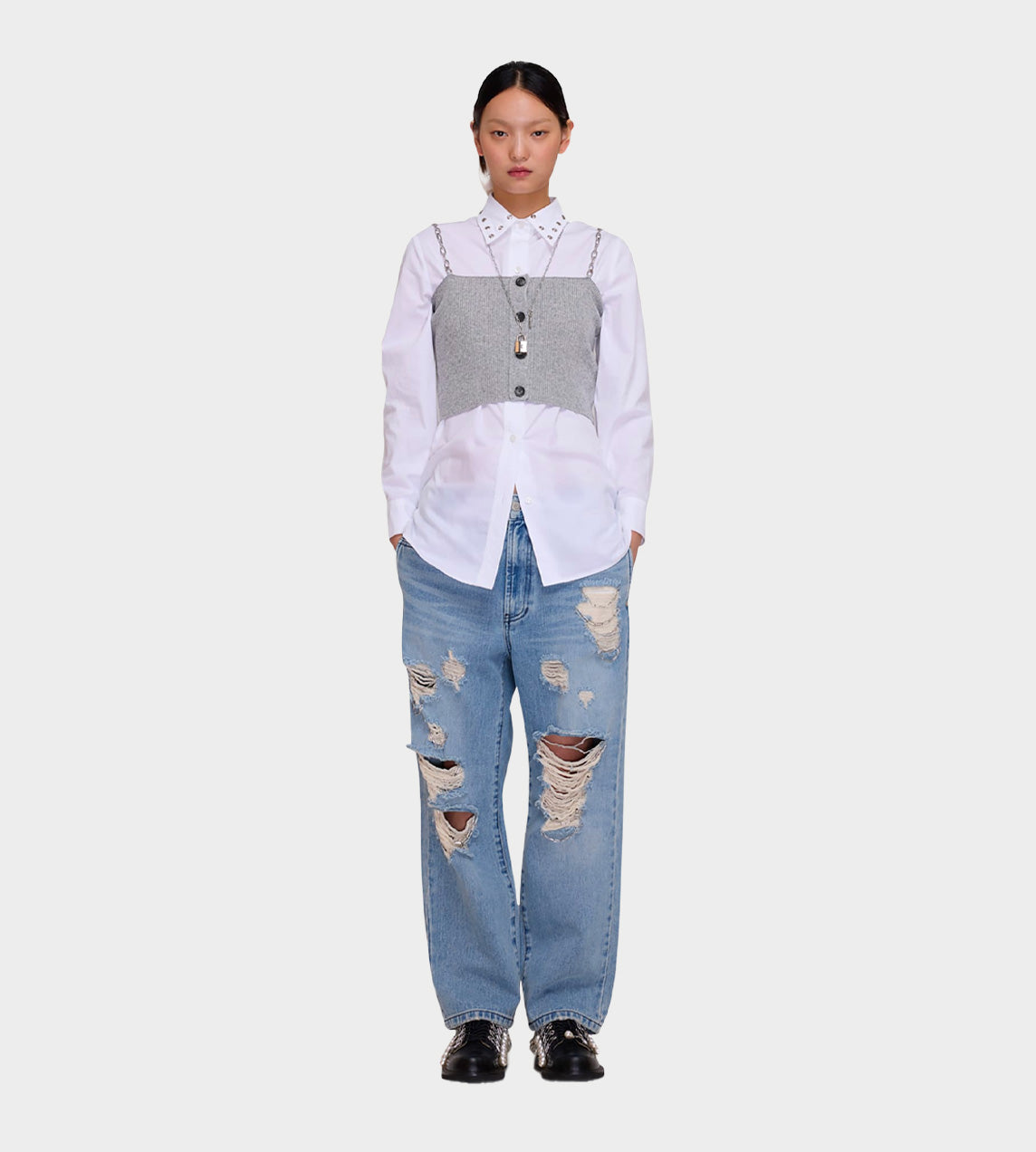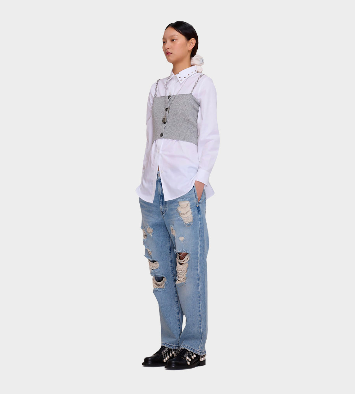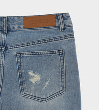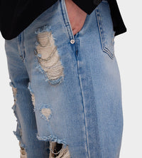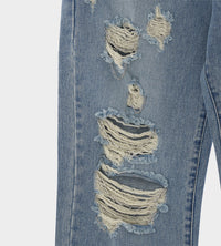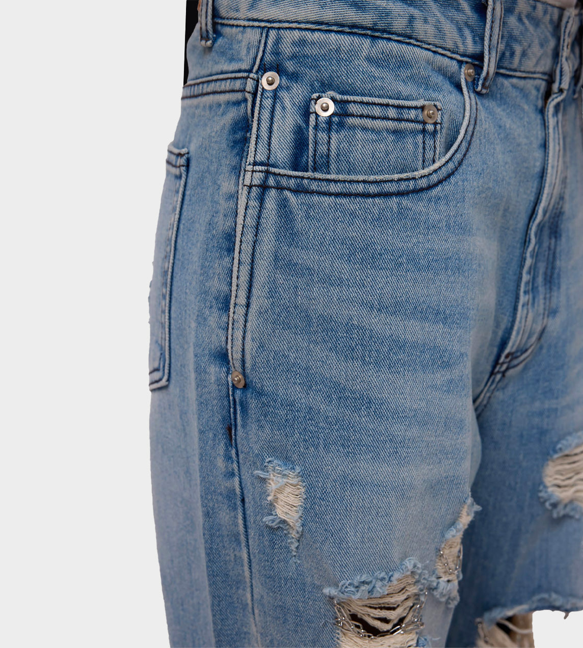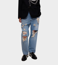 Straight leg, light washed "destroyed" denim jeans with metal chains strands adorning the rips. Silver tone hardware with mid rise fit.