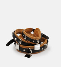 Large full grain leather, 2 toned dog collar. Silver tone hardware, with adjustable belt closure. The interior of this collar is padded for additional comfort.