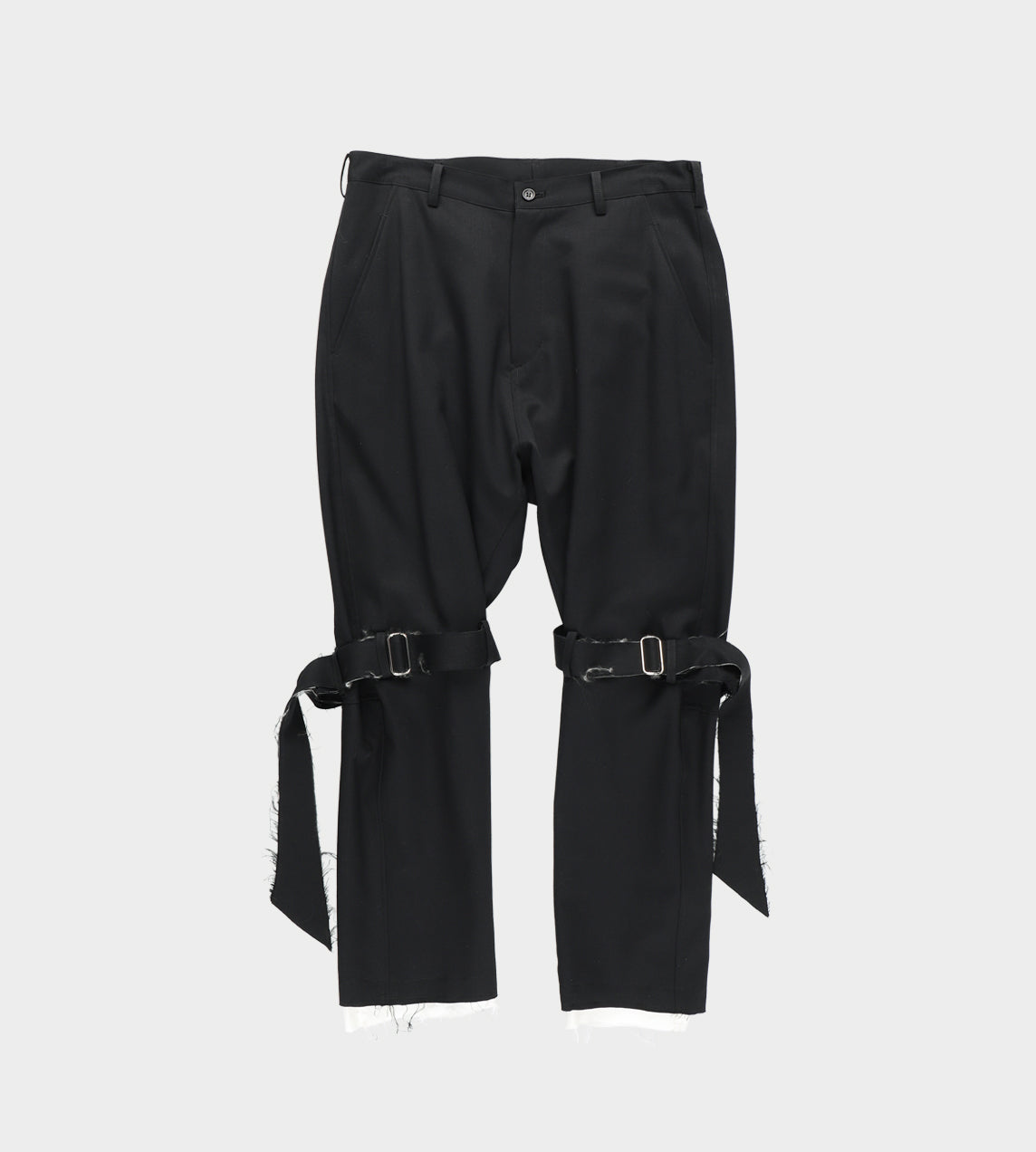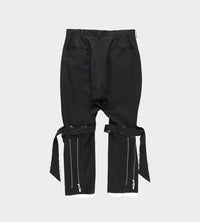 Signature lightweight gabardine cropped pant with trouser pockets and a dropped crotch. This pant has a straight leg and with a belted strap just below the knee that can be tightened. Another feature is a zipper at the back of the calf area that can be zipped up to slim the lower half of the leg to make it fitted. Lining is intentionally longer and has a unfinished frayed edge.