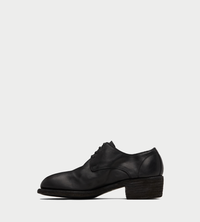 Classic Guidi black derby shoe in the finest horse leather. These oxfords feature a round toe, a low block heel, and a lace-up front closure.