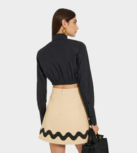 Beige cotton tweed skirt. High waist. Short length. Zip fastening at the back. Darts at the front and back. Contrast wave trim.