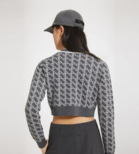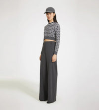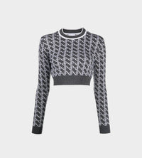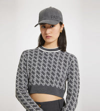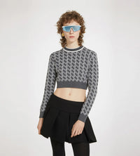 Anthracite grey wool jumper. All-over JP jacquard pattern. Cropped silhouette. Crewneck with white detail. Ribbed collar, cuffs and hem.