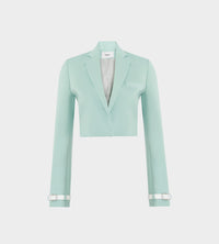 COPERNI blazer in green, paneled wool construction, notched lapel, structured shoulders, long sleeves, pin-buckle strap cuffs, chest welt pocket, straight hem, cropped length, tailored fit.