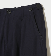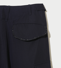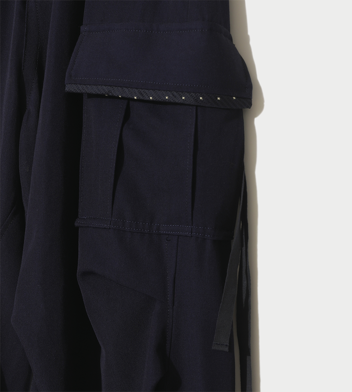 Cropped wool cargo pants with a wide-leg silhouette, front pleats, and inset and back flap pockets. Side cargo pockets and deconstructed logo patches at the sides add a utilitarian edge. Silk exposed lining and darting at the knees enhance texture and structure.
