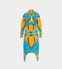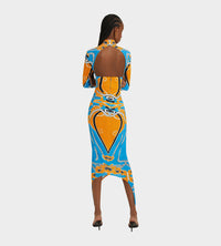 Eco-viscose and organic cotton blend dress. Seasonal Tapisserie print. Midi length. Fitted style. High neck with button and keyhole at the front. Open back. Long sleeves. Zip fastening at the back. Asymmetric curved hem.