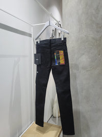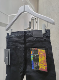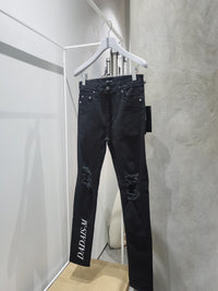 Slim leg, 5 Pocket stretch denim jeans with distressed knees, and DADA ism logo on leg.