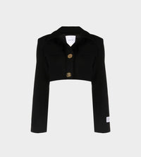 Black double wool crepe jacket. Cropped length. Tailored silhouette. Notch lapels. Flap chest pockets. Gold-tone Patou-engraved buttons. Buttoned cuffs. Patou label on the left sleeve. Lined.