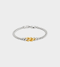 On a large curb chain, six graded links are individually cast and soldered together, adding a magnified expression to the original design. The two centered links are gold plated in 18 karat gold, and the bracelet holds a customized Tom Wood lock mechanism.