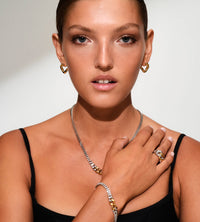 Made with 925 sterling silver in polished white rhodium and 18K gold plating. All metals are 100% recycled.