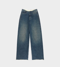 Denim 5-pocket navy blue jeans from MM6 Maison Margiela. Crafted with a vintage effect, this pair falls with wide legs and features a zip fly with a button and hook, classic