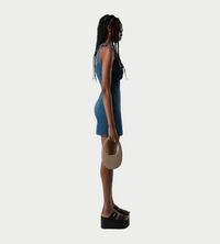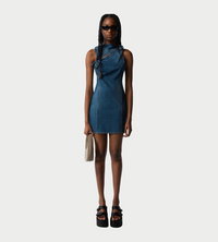Coperni's signature floral swirls are reinvented in denim, seen here on a fitted minidress silhouette. Inspired by a vintage shift, the dress features a dynamic cut-out neckline punctuated by three twisted fabric roses for a knotted effect.