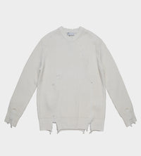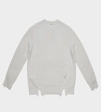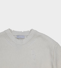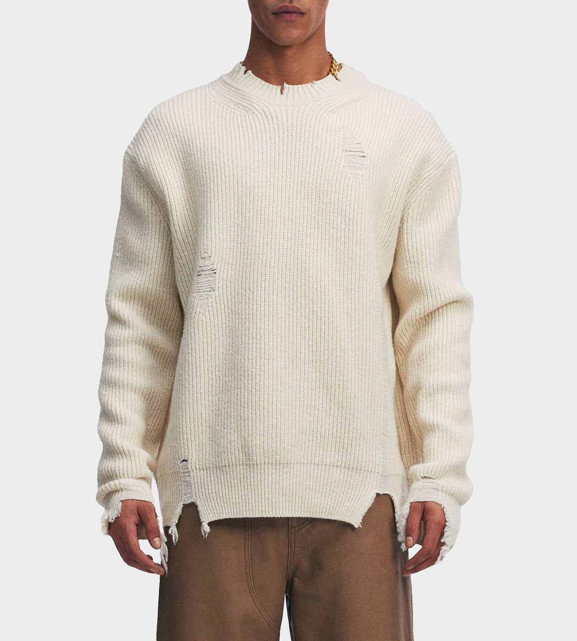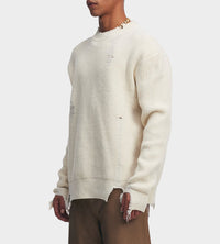 Chunky ribbed, crewneck sweater with strategic distressing. Slightly longer sleeves with ribbed waistband.