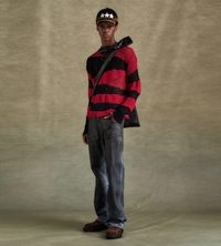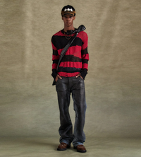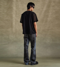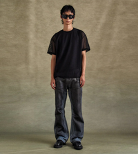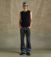 Full length, straight leg denim pants. Stone shed cotton with coated and spray wash finish. Dart and double stitch details with spray washing. Andersson Bell engraved detail.