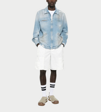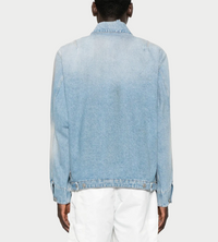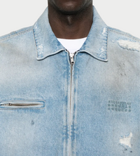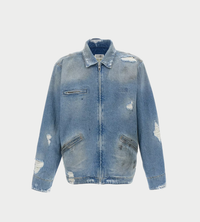 Non-stretch denim jacket. Fading, distressing, and smudging throughout. Zip pocket and welt pockets. White stitching at back collar. Dropped shoulders. Adjustable button fastening at cuffs. Adjustable button tabs at back hem. Zip pocket at interior. Full herringbone twill lining. Logo-engraved silver-tone hardware. Contrast stitching in tan.