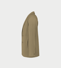 This tailored, double-breasted pleated jacket in riverside grey features notched lapels. It is partially lined and has side pockets, two inner pockets and a double back vent.