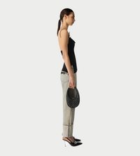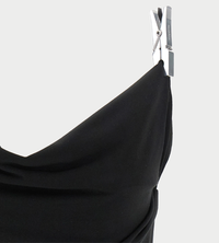 Crafted from soft lightweight jersey, this black top has a distinctive draped neckline that softly settles in a deep, asymmetrical U-shape that fully showcases the neckline and shoulders. The top is supported by thin spaghetti straps, each embellished with a brooch playfully shaped like silver clothes peg. The style was showcased at Coperni's SS25 show held at Disneyland Paris, an ode to childhood and the magic of fairytales. The silver clip is a nod to Disney's classic animations and particularly laundry scenes featuring enchanting female characters, such as Snow White and Cinderella who thrive, flourish and forever delight in stories that continue to capture the imagination.