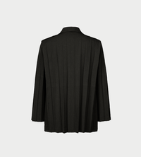 This tailored jacket is made from glossy material with wide accordion pleats. The use of ribbed, woven recycled polyester material creates a texture that is moderately dry to the touch, giving a casual impression despite the formal style. There are pockets on both sides.