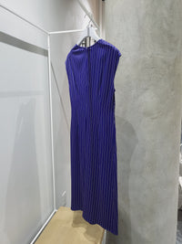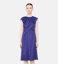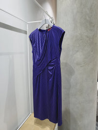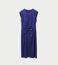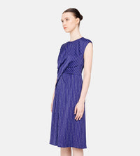 Sleeveless cap sleeve pinstripe dress with draping in the front to give the illusion of the fabric being wrapped. Slight A-line in the skirt, with invisible back zip for ease